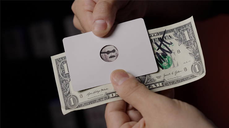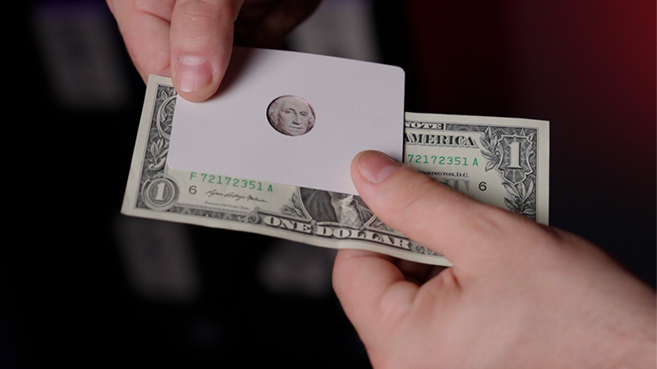 The HOLE CARD is placed over the DOLLAR BILL showing George Washington's face. Without any moves you slide Georges head up to the top of the bill, then across to the right and then to the left. Finally you slide his head back onto his shoulders where it belongs. Immediately hand back the borrowed bill and show the card on both sides.